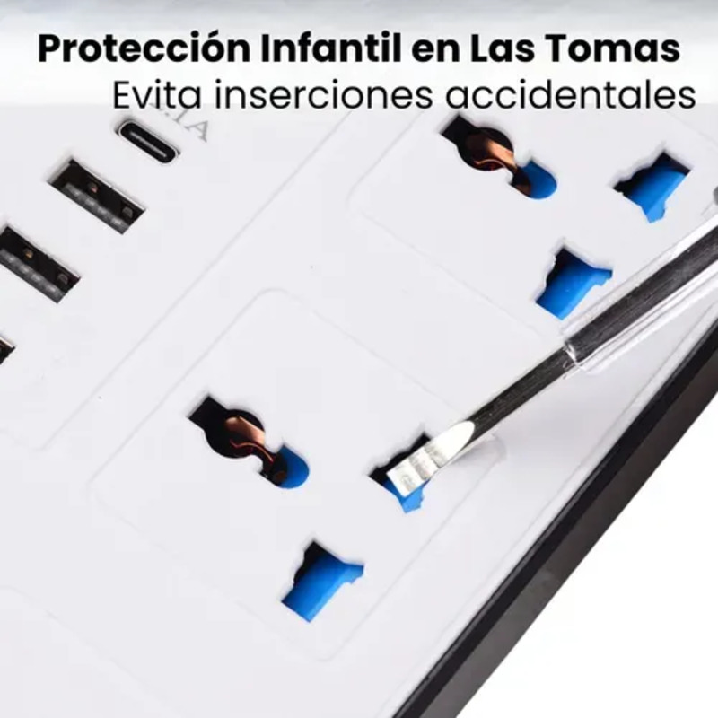 Este alargue prolongador de 27 x 6 cm combina 3 tomas universales, 2 puertos USB y 1 puerto Tipo-C, brindándote múltiples opciones de conexión en un solo dispositivo.
