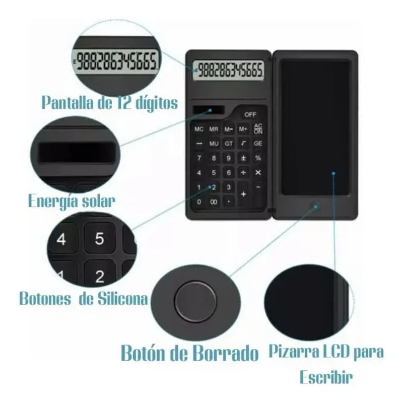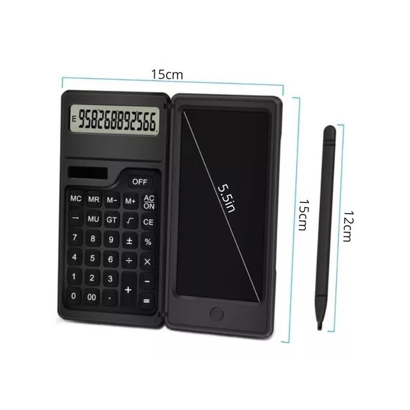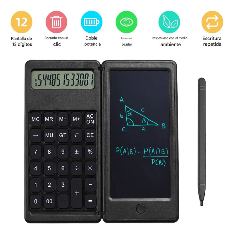Esta calculadora 3 en 1 combina cálculo preciso, escritura rápida y portabilidad. Incluye pizarra mágica LCD de 5.5″, alimentación solar + batería interna y un bolígrafo oculto, todo en un diseño compacto y ecológico. Perfecta para estudiantes, profesionales y amantes de la organización.