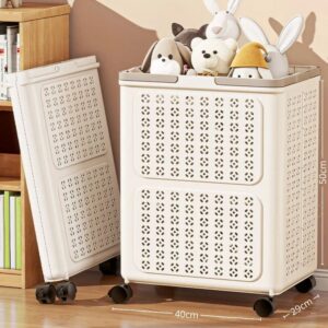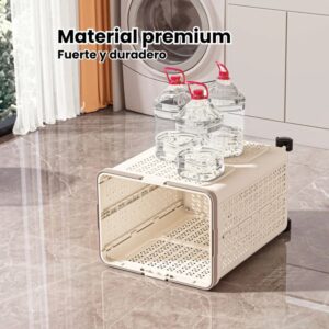 Organiza tu ropa sucia de manera práctica con este cesto plegable de plástico color crema. Cuenta con ruedas y manijas resistentes para transportar fácilmente, y diseño calado que permite ventilación.