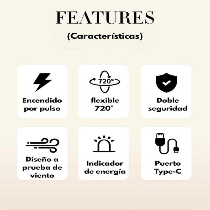 - Luz LED que muestra el nivel de batería, para que nunca te quedes sin energía. Recargalo fácilmente mediante USB-C, ¡olvidate de los encendedores desechables!