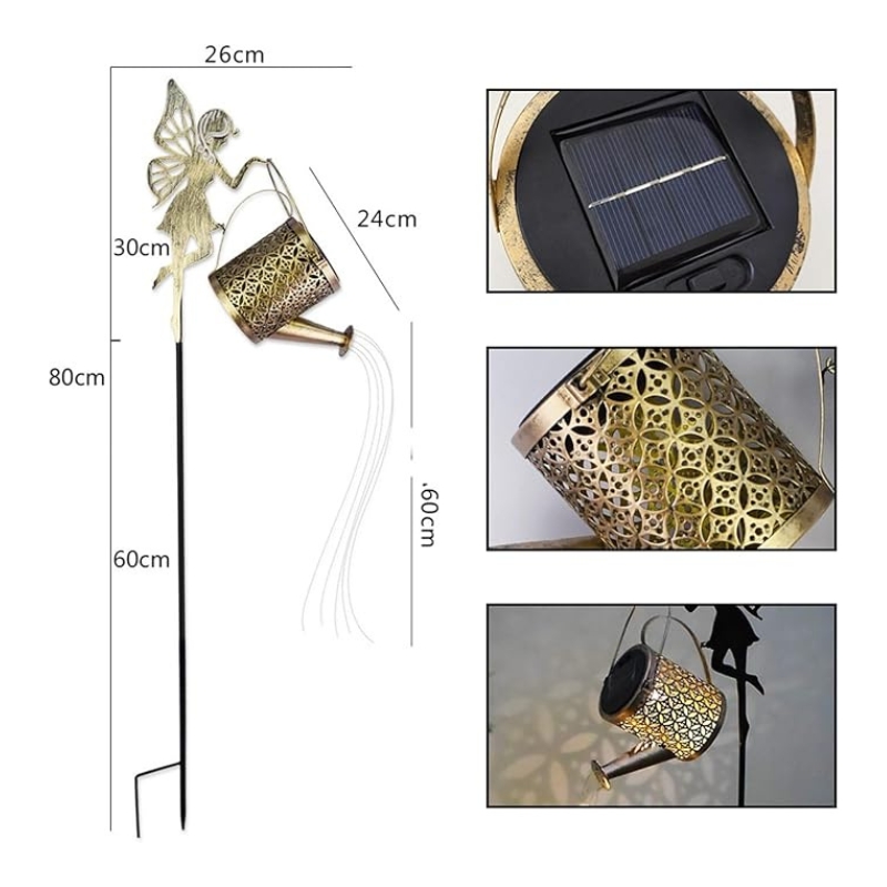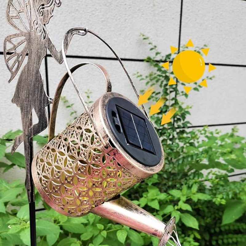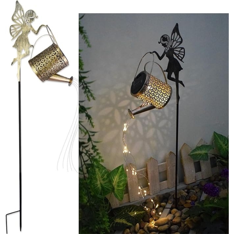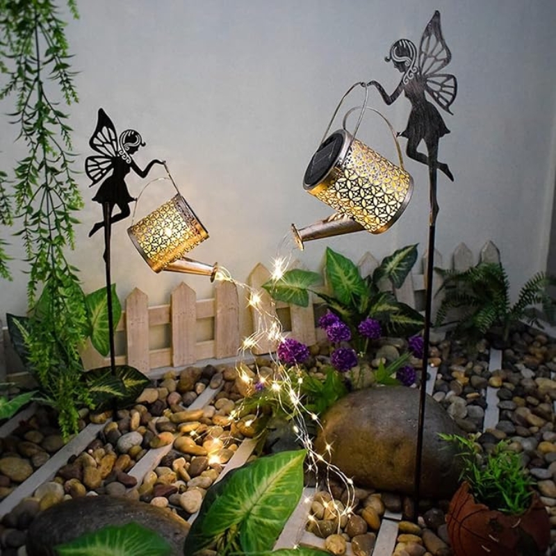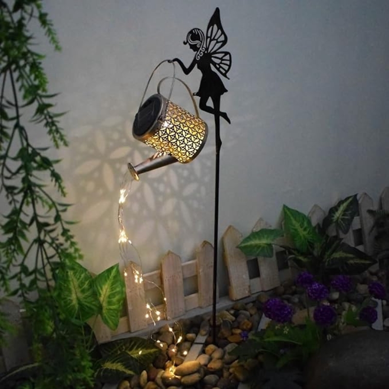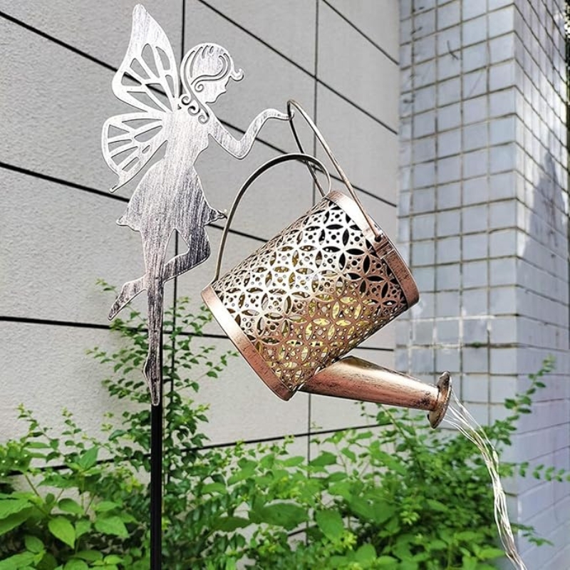 Incluye una figura de hada de hierro con regadera suspendida y 5 hebras de luces LED cálidas que imitan el agua cayendo.