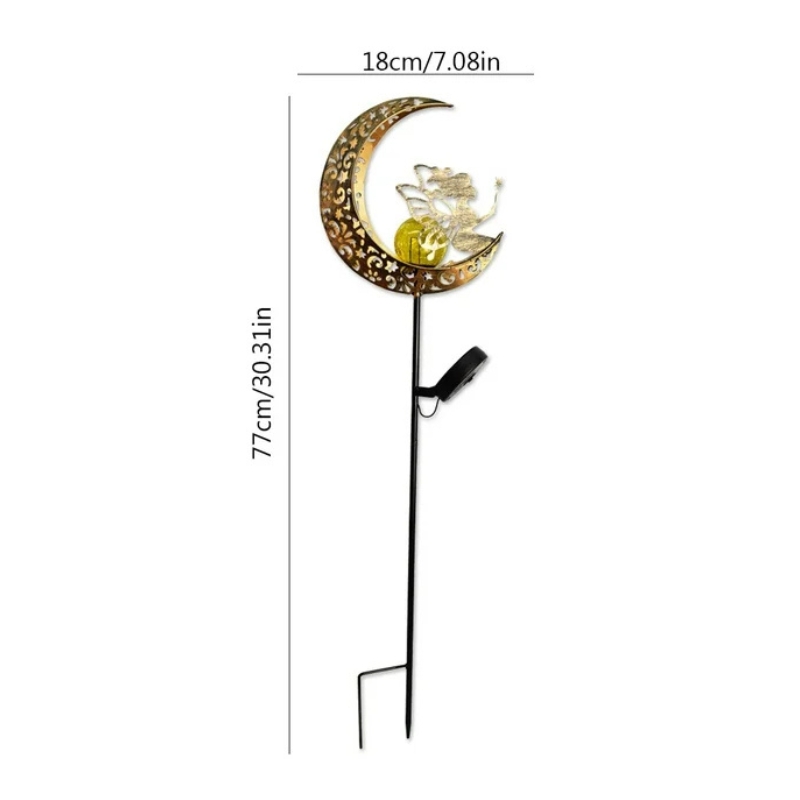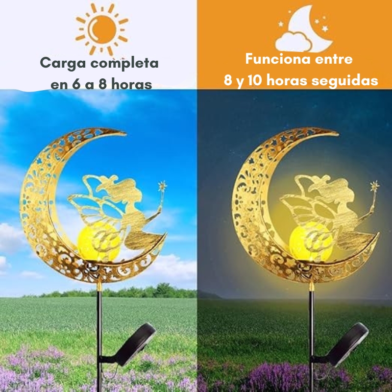 Una combinación única de hierro forjado con diseño tridimensional: la luna sostiene una figura de hada con varita, y un colgante en forma de gota (o estrella) completa el detalle celestial.