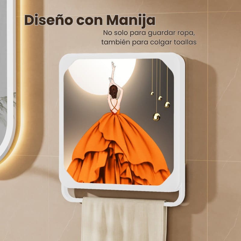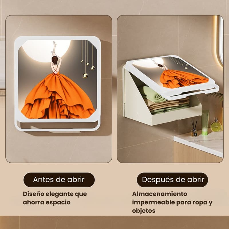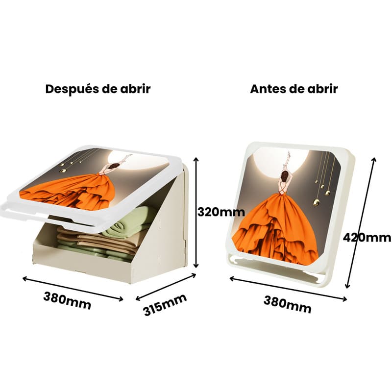 Plegable ahorra espacio: cerrado ocupa poco y luce como un cuadro; abierto ofrece un cajón profundo para apilar toallas, paños o ropa.