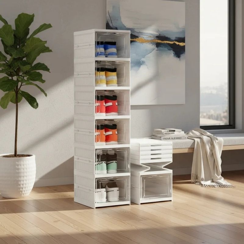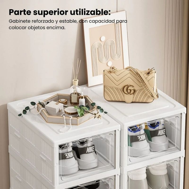 Su acabado blanco y minimalista combina con cualquier ambiente, mientras que el frente transparente permite ver y elegir fácilmente el par que necesitás, protegiéndolo del polvo y la humedad.