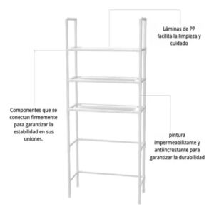 Con 155 cm de alto, 47 cm de ancho y 25 cm de profundidad, este estante aprovecha al máximo el espacio vertical sin ocupar lugar extra. Su espacio libre inferior de 62 cm encaja perfectamente sobre el inodoro, mientras que sus niveles de 39 cm y 22 cm ofrecen la altura justa para organizar toallas, frascos o productos de higiene con total comodidad.