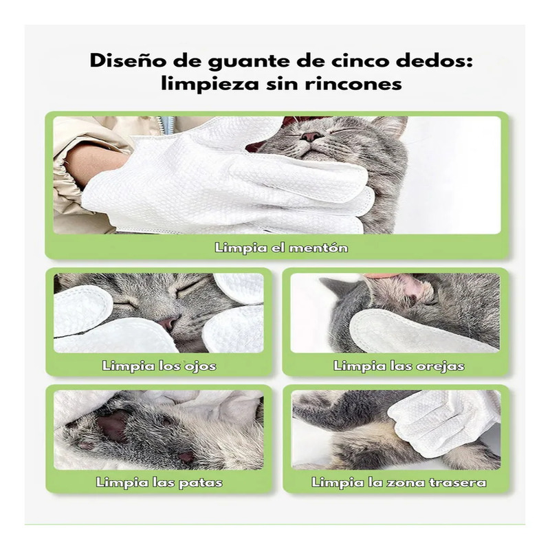 Su diseño de guante con cinco dedos permite limpiar con facilidad cada rincón: mentón, orejas, ojos, patas y zona trasera. Máxima practicidad en cada pasada.