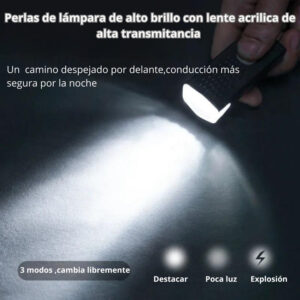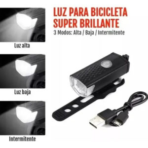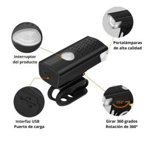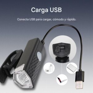 Faro delantero 300 lúmenes con modos alta, baja e intermitente. Recargable vía USB, batería de polímero de litio integrada.