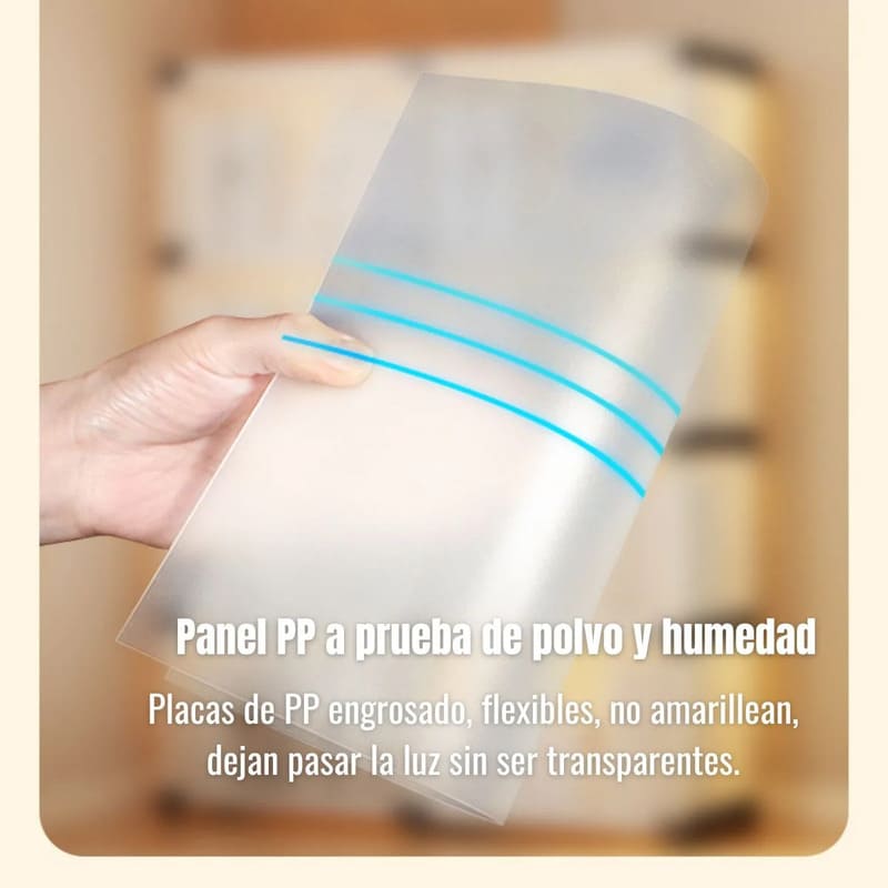 Cuenta con marco metálico reforzado que aporta estabilidad y durabilidad, combinado con paneles plásticos PP, livianos, resistentes y fáciles de limpiar.
