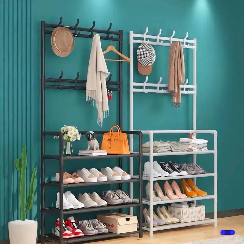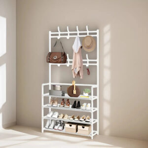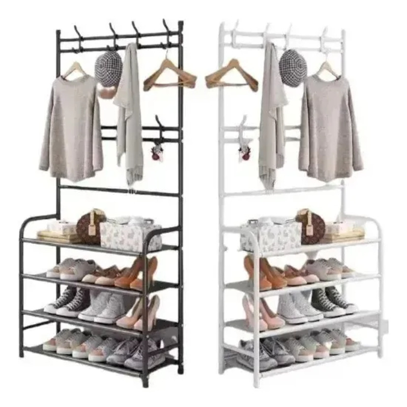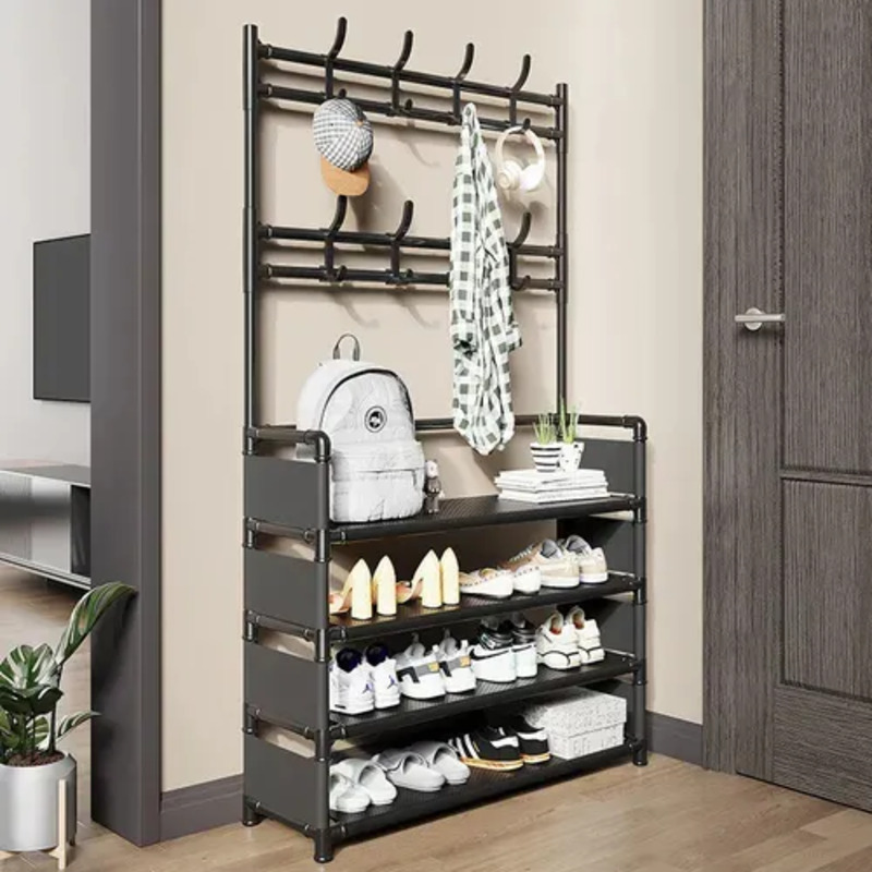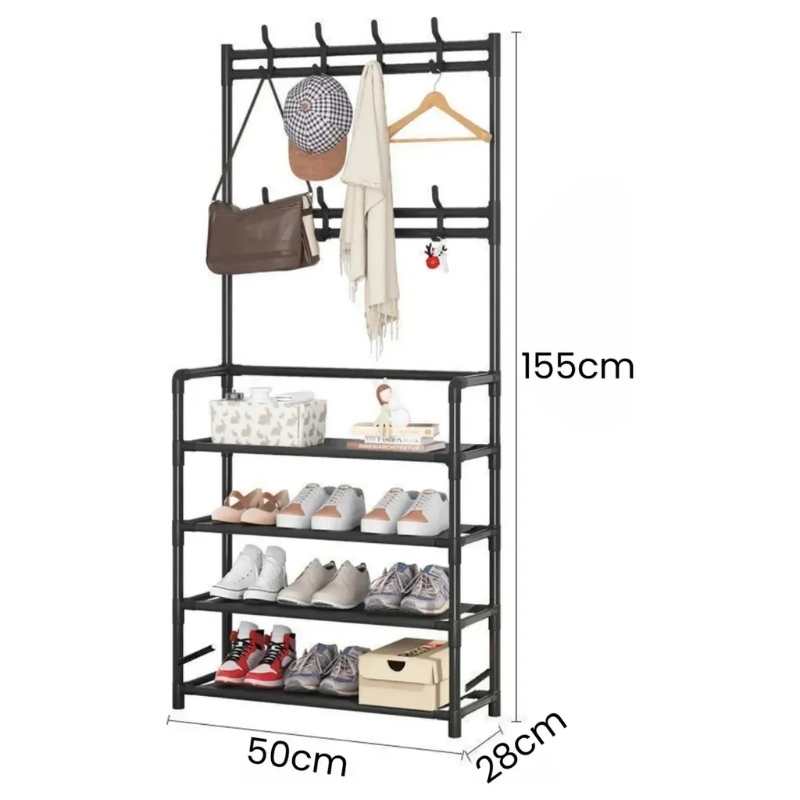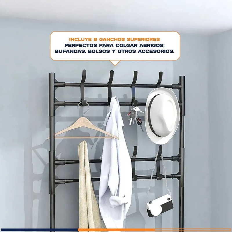El Organizador con 8 Ganchos y 4 Niveles es la solución ideal para mantener zapatos, abrigos y accesorios organizados en un solo lugar. Su diseño vertical combina estantes amplios con perchero superior y ganchos laterales, logrando máxima capacidad sin ocupar demasiado espacio.