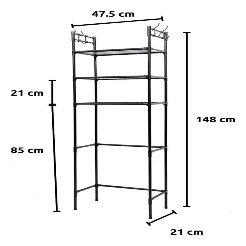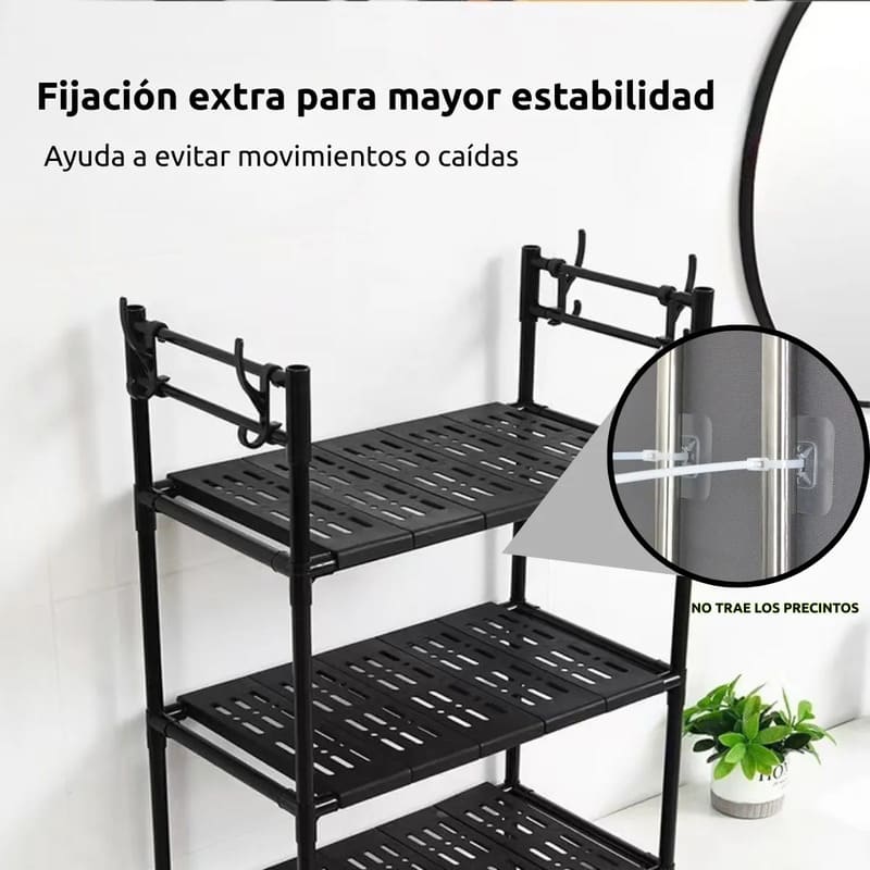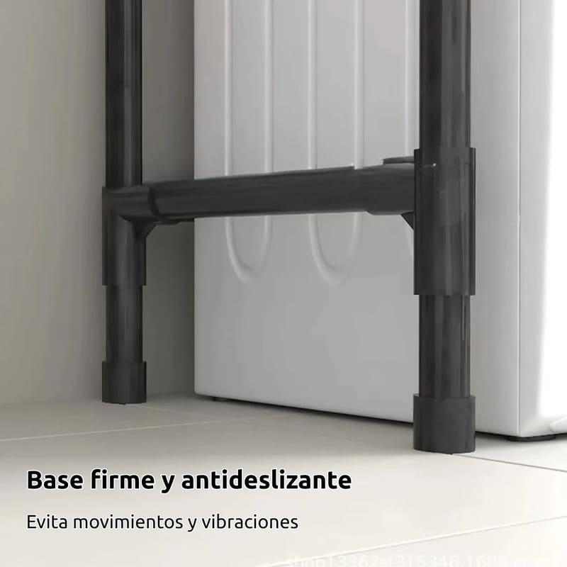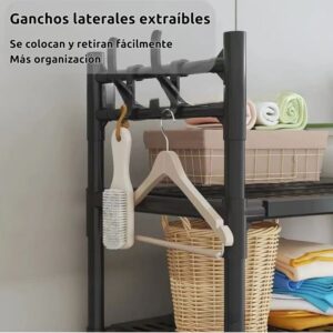 Fabricado con tubos metálicos resistentes y estantes de plástico PP, soporta el uso diario en ambientes húmedos sin deformarse.