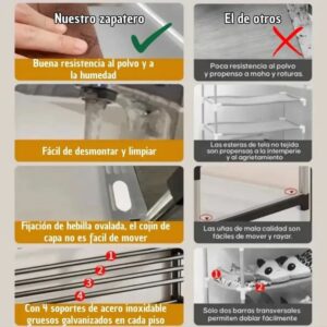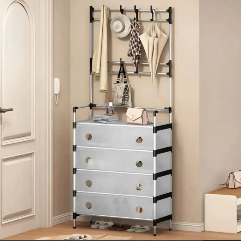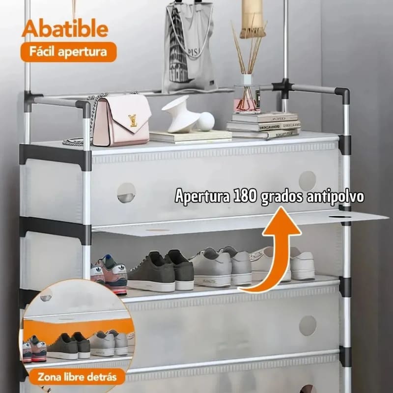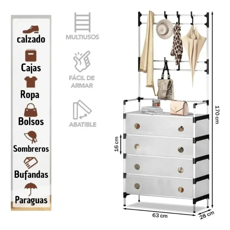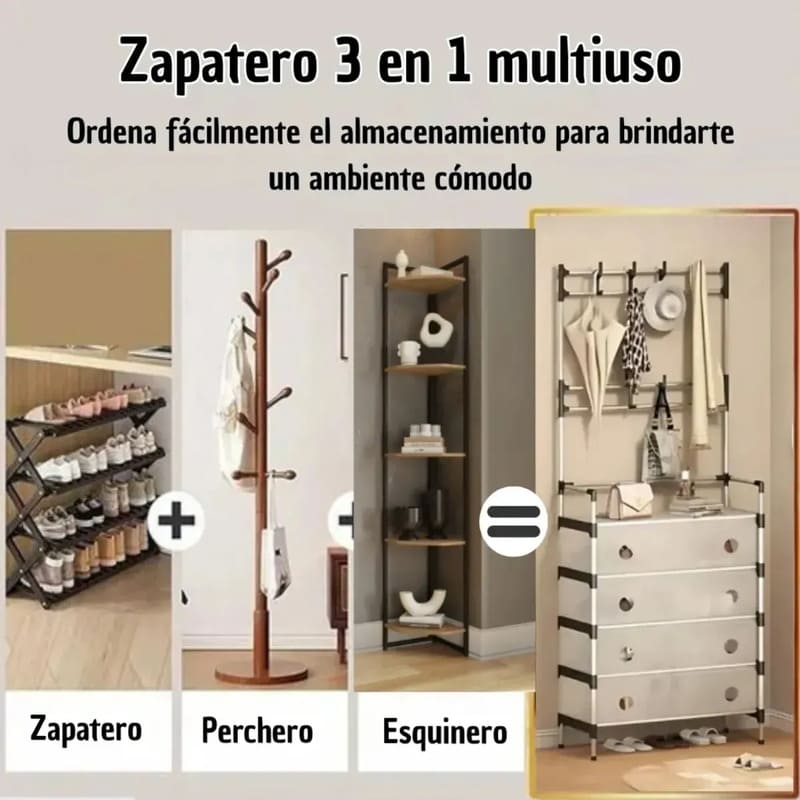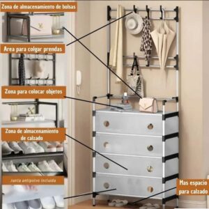 Combina zapatero, perchero y esquinero en una sola estructura. Incluye 8 ganchos superiores ideales para colgar bolsos, mochilas, sombreros, abrigos y accesorios de uso diario.
