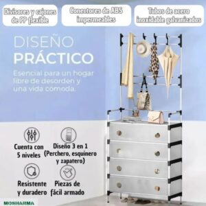 Los niveles son ajustables: podés retirar una bandeja intermedia y unir dos niveles para colgar prendas largas o voluminosas, logrando un uso práctico y adaptable según tus necesidades.