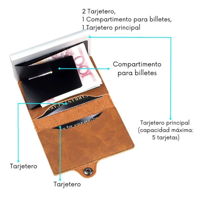Este tarjetero combina elegancia y practicidad: incluye 2 ranuras adicionales, espacio para billetes y un compartimento principal con capacidad para 5 tarjetas, ideal para uso diario o viajes.