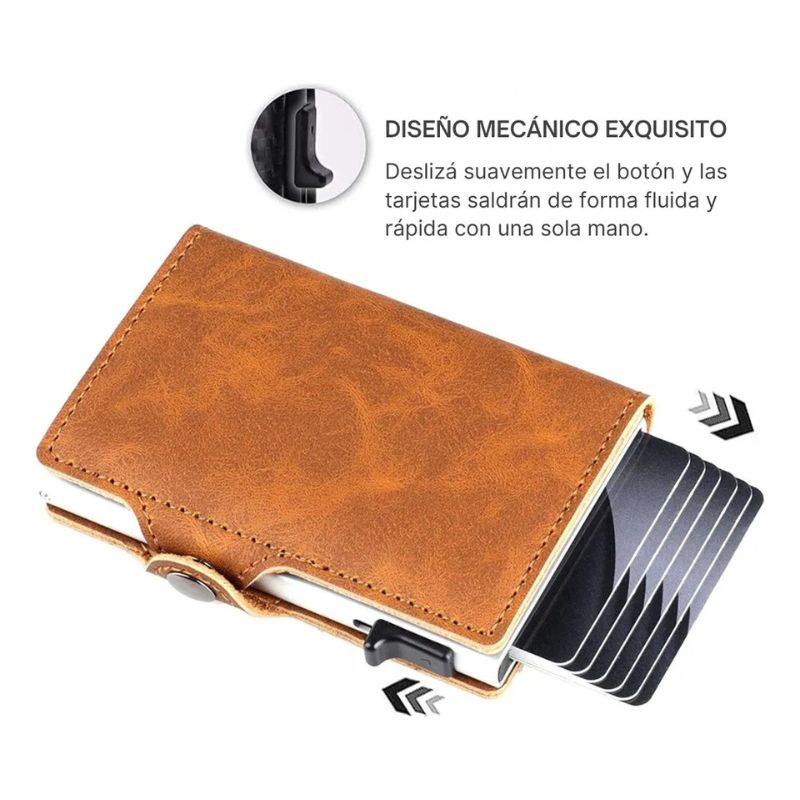 Protegé tus tarjetas con estilo con este tarjetero RFID de cuero sintético, diseñado con expulsor automático y capacidad inteligente. Compacto, liviano y seguro: llevá todo lo esencial sin abultar tus bolsillos.